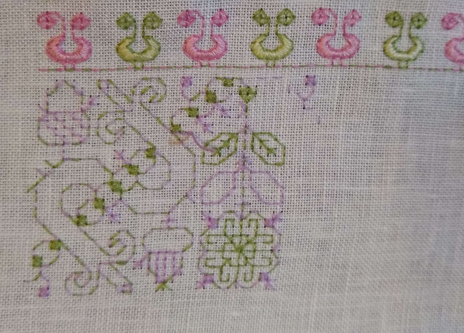 I am not sure I am happy with these colors. First, here are some bad photos of the double running stitch.